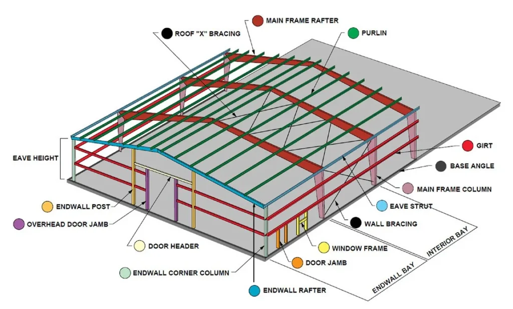 The distance between the outside flanges of end wall columns in opposite end wall is considered the building length. End bay length is the distance from outside of the outer flange of end wall columns of center line of the first interior frame columns. Interior bay length is the distance between the center lines of two adjacent interior main frame columns.